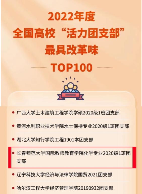 近日,在由共青团中央基层建设部指导、中国青年报社开展的2022年度高校“活力团支部”风采展示活动中,365官网国际教师教育学院化学专业2020级1班团支部被评为2022年度全国高校“活力团支部”最具改革味TOP100榜。