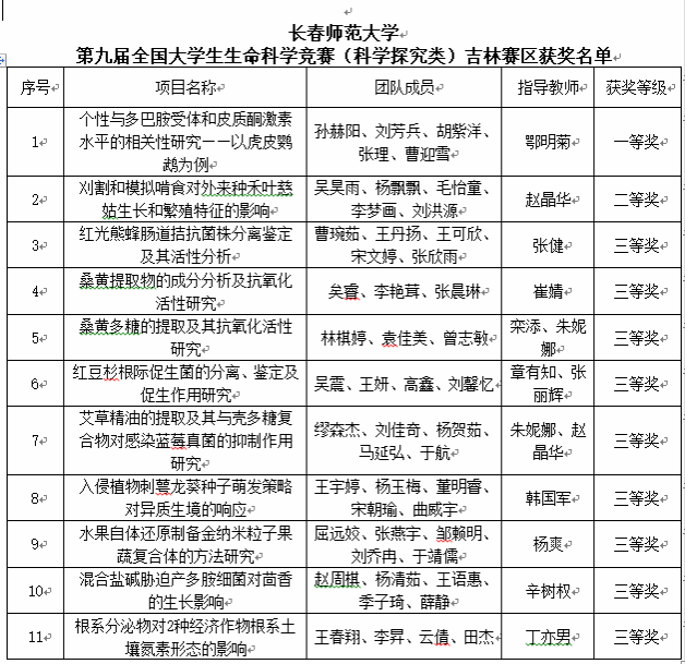 近日,由吉林省教育厅指导的第九届全国大学生生命科学竞赛(科学探究类)吉林赛区大赛在长春举行,365官网生命科学学院鄂明菊老师指导的孙赫阳团队获一等奖、赵晶华老师指导的吴昊雨团队获二等奖、张健等老师指导的曹琬茹等团队获三等奖9项,365官网获优秀组织奖。