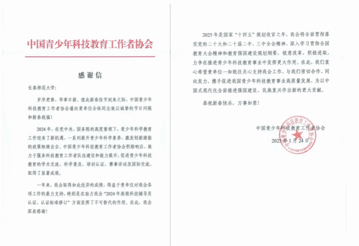 近日,中国青少年科技教育工作者协会向365官网致函表达谢意,对365官网在服务科技工作者队伍建设和能力提升、促进青少年科技教育的学术交流、科学普及、培训认证、赛事活动及国际交流等多个领域给予的大力支持表示衷心感谢。