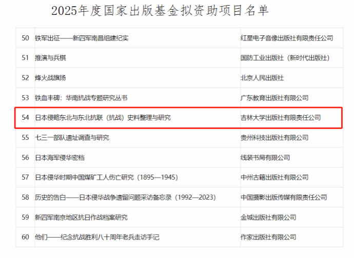 作为国家级出版领域专项基金,国家出版基金以“体现国家意志、传承优秀文化、推动繁荣发展、增强文化软实力”为宗旨,聚焦重大主题出版、历史文化传承等公益性项目资助,2025年度全国共资助559项学术著作。张晓刚教授项目围绕东北抗战史,系统整理日本侵华与东北抗联史料,兼具历史价值与现实意义,将为深化抗战研究、传承红色基因提供史料与理论支撑。