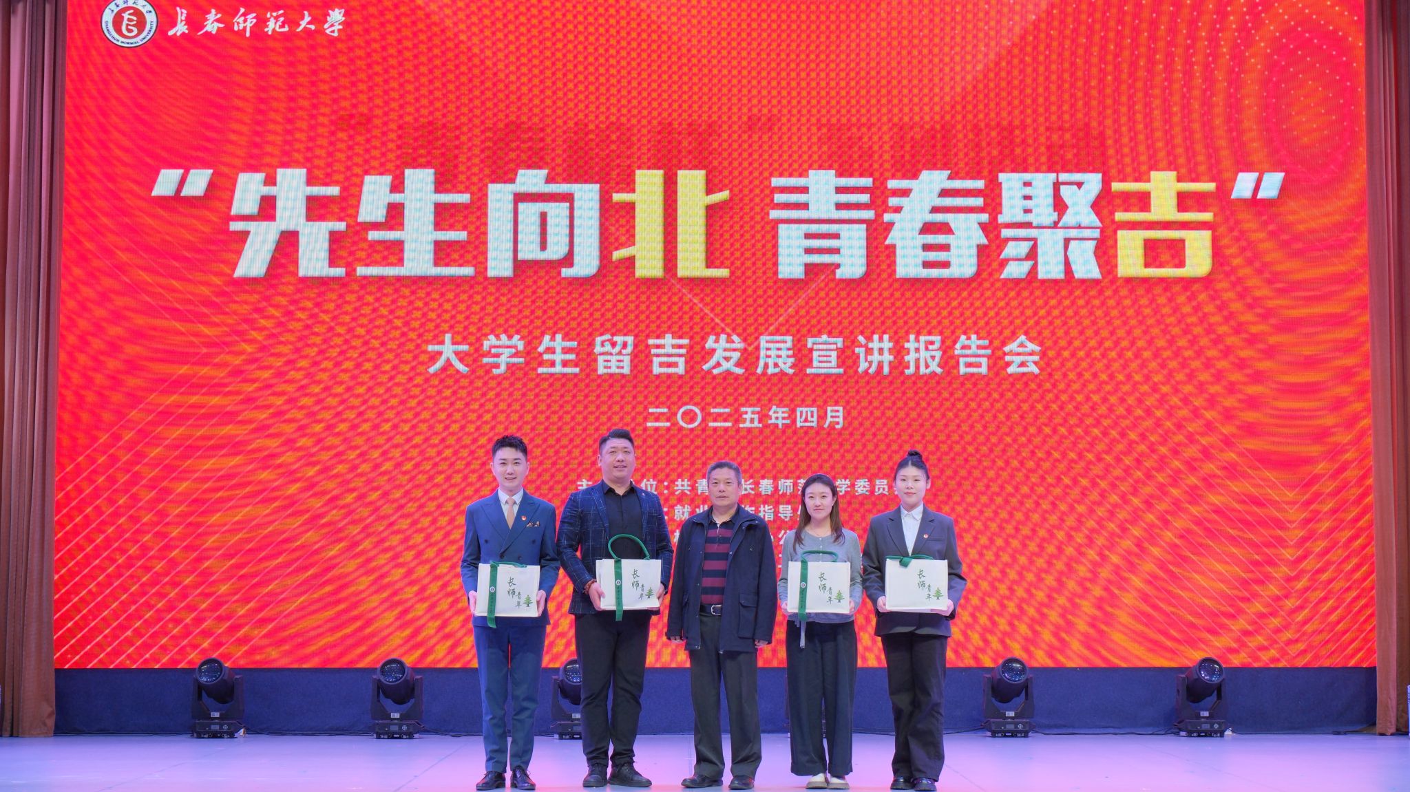 4月23日,由团委主办,就业工作指导处、校友工作办公室、关心下一代工作委员会协办的“先生向北 青春聚吉”大学生留吉发展宣讲报告会在长师会堂举行。活动以“先生向北 青春聚吉”为主题,通过榜样宣讲、城市推介、政策解读等环节,全方位展现吉林对青年人才的诚意与支持。吸引约500名师生参与。